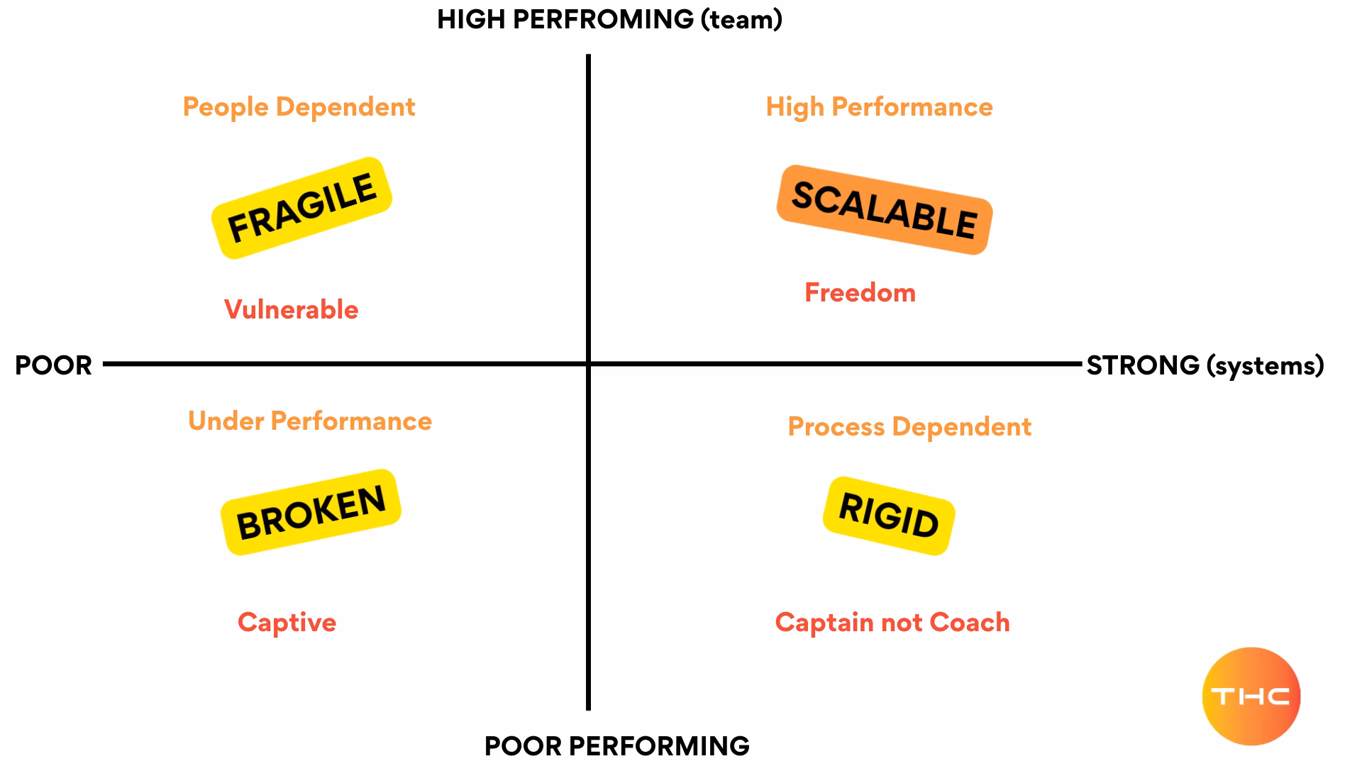 • Top right (strong systems, strong team): The only sustainable model that allows for true scalability and owner freedom